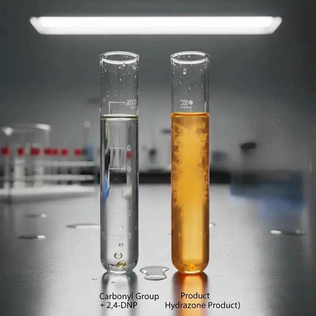 A positive 2,4-DNP test is confirmed by the formation of a yellow, orange, or red precipitate. The intensity of the color depends on the nature of the carbonyl compound. Aliphatic aldehydes and ketones usually give a yellow precipitate, while aromatic carbonyl compounds form deeper orange or red precipitates due to greater conjugation.